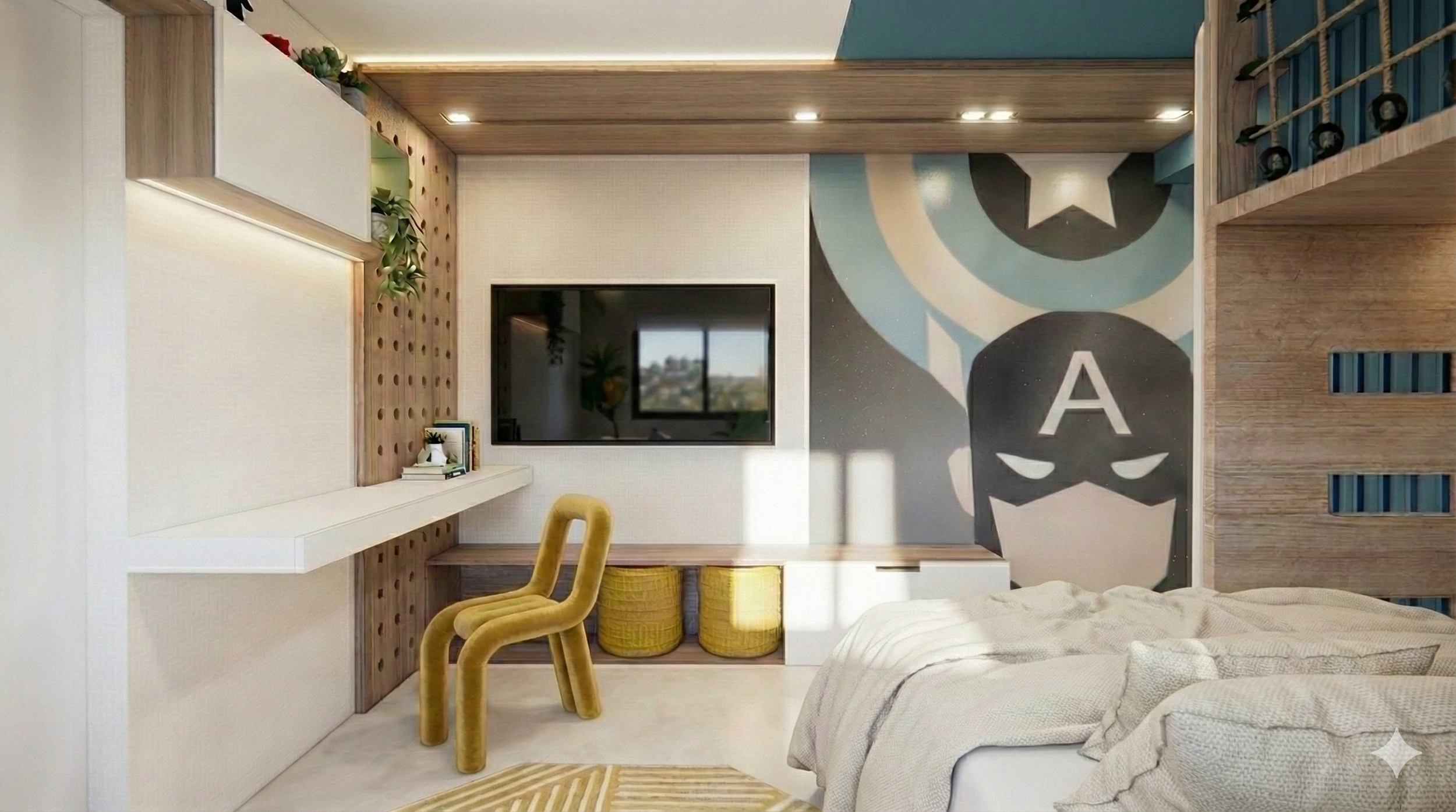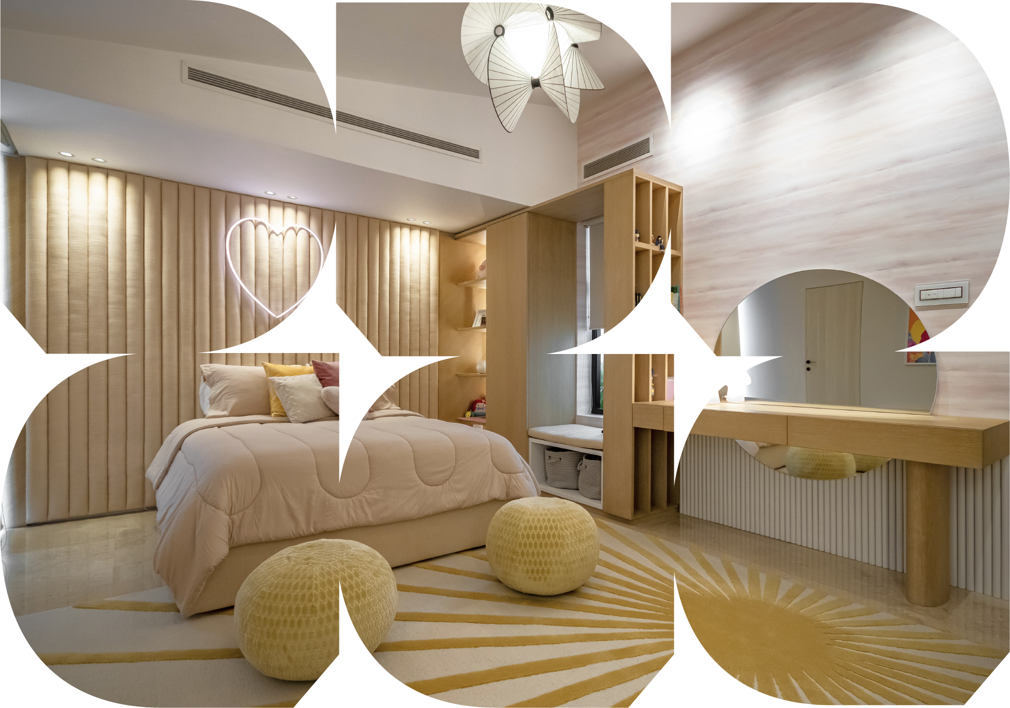 Amamos este lugar, vida, texturas, sensaciones son las palabras con las que definiriamos este espacio, una habitacion-playroom disenada para una nina, colores vivos como el verde, madera calida y papel tapiz, todo disenado pensando en las necesidades de la nina, la tematica era un lugar de adentro que se sintiera afuera, por eso utilizamos colores vivos como el verde, las lamparas son alusivas o representan las nubes, el papel tapiz representan las nubes en un estado mas conceptual y materiales naturales como la madera.