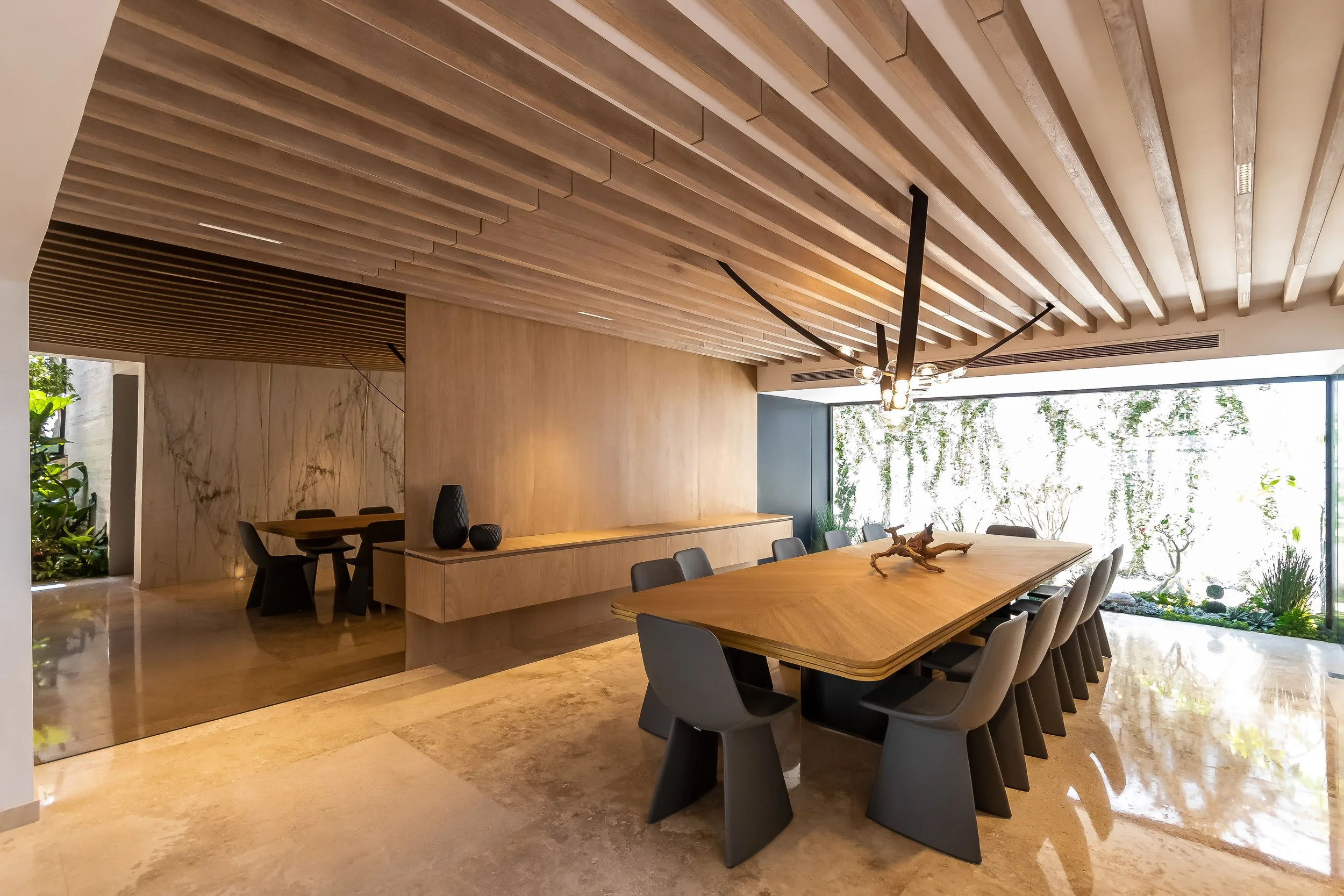The new architecture flows organically, interweaving with the surrounding greenery to bring clarity and rhythm to the home’s internal dynamics. Additional expansions—like the office, library, and balconies—reshape the exterior envelope of the house, which now evolves into a composition of planes, lines, and volumes softly overtaken by nature and light, a timeless palette of materials and fleeting, carefully crafted atmospheres define the space. With a new surface area of 813 m², the house becomes a living artwork—where the natural world is not an addition, but a vital part of its essence.